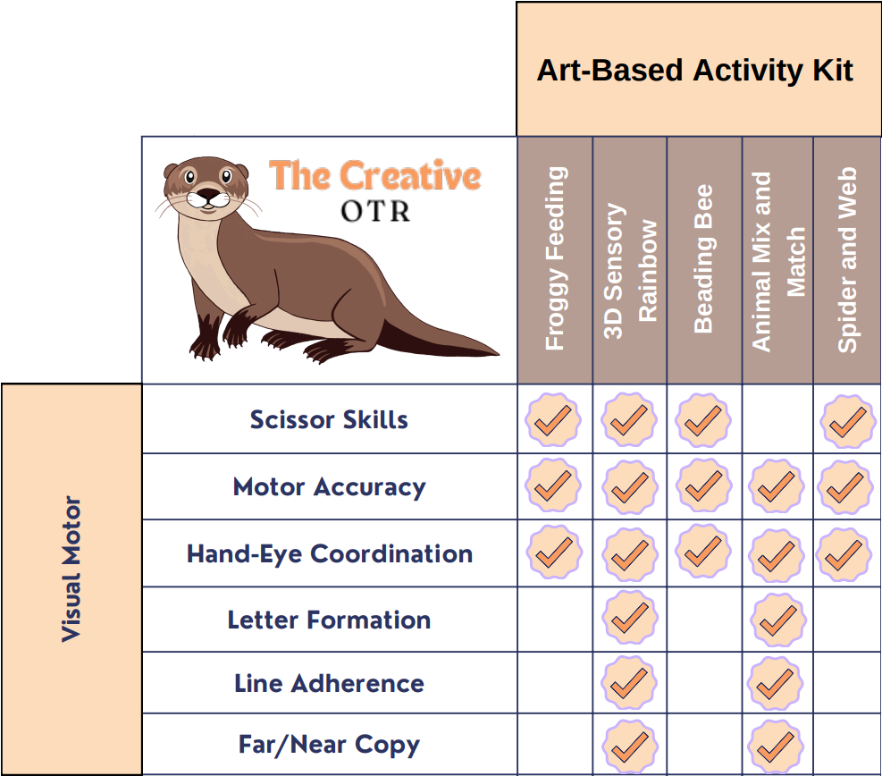 Visual motor skills are characterized by coordinating visual perception and fine motor skills. Visual motor skills include scissor skills, motor accuracy, hand-eye coordination, letter formation. These skills are used for many occupations and tasks such as writing, copying from board or desk, reading, dressing, and self-care.