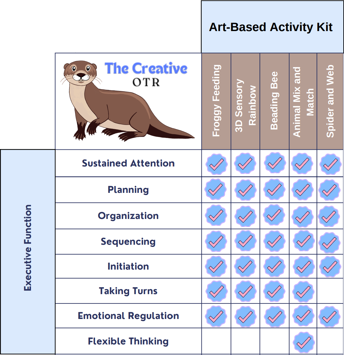 Executive function is cognitive processing skills to enhance development and knowledge needed to make decisions, plan, and carryout the plan. Executive function skills include sustained attention, planning, organization, sequencing, initiation, taking turns, emotional regulation, and flexible thinking. These skills are used for many occupations and tasks such as focusing on a task while distracted, starting and completing steps of a task in the correct order, keeping desk, room, backpack clean and organized to find materials, turning homework in on time, managing time, taking turns in a conversation or activity, managing stress or difficult situations, making friends, learning a new task, and changing schedule or routine.